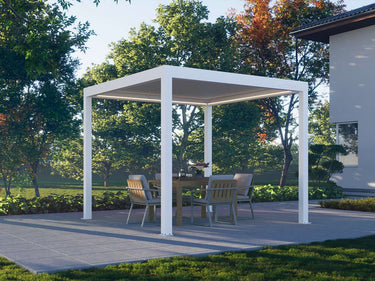 • Weiße Pergolux Pergola auf einer Terrasse mit Esstisch und Gartenstühlen im Sonnenschein.