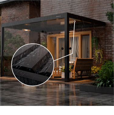 • Optimierte Wasserableitung. Profitiere vom neuen RainLUX™-System: präzise Wasserableitung bei gleichzeitig leiserem Betrieb der Lamellen. Die freistehenden Modelle Pergola 4 Pro Max und Pergola 4 benötigen für die Montage kein Silikon mehr und sind somit einfacher denn je aufzubauen.