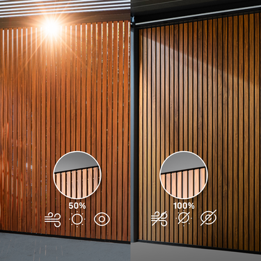 Wähle dein bevorzugtes Maß an Privatsphäre, wenn du deine Lamellenwand montierst. Entscheide dich für die offene Variante mit Zwischenräumen für einen teilweisen Sichtschutz oder für die geschlossene Variante für vollständige Privatsphäre. Deine Pergola, deine Privatsphäre, deine Regeln.